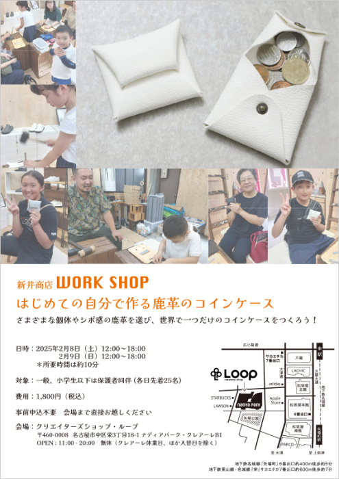 今回は、Loop2024に期間出店する(1月7日〜2月16日)「新井商店」が、“革のカシミヤ”と呼ばれる、とても柔らかい鹿革のコインケースを作るワークショップを開催。さまざまな個体やシボ感の鹿革で作る、世界で一つだけのコインケースです。