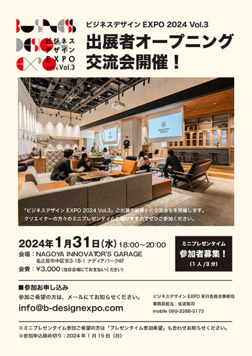 問い合わせ先 一般社団法人中部広告制作協会 ビジネスデザインEXPO担当理事(株式会社シンクスデザイニングプロ 佐波敬司)info@b-designexpo.com