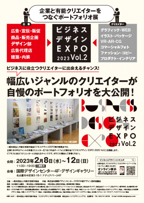 ビジネスデザインEXPO実行委員会事務局(一般社団法人中部広告制作協会事務局内)tel052-264-1616、fax052-241-2555、info@b-designexpo.com、デザインギャラリー(会期中会場専用tel052-265-2126)