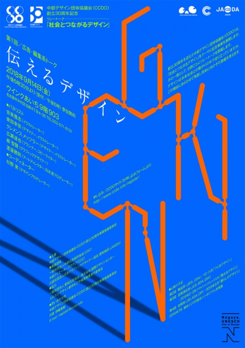 中部デザイン団体協議会(CCDO)は、名古屋圏のデザイン分野の振興を目指し、1988年7月、異分野のデザイン団体が集結して設立。創立30周年を迎える今年から1年間を記念事業年と位置づけ、「社会とつながるデザイン」を全体テーマにさまざまな事業を実施。その一環として、加盟11団体が広告・編集系、製品系、空間演出系、空間系の4つの領域に分かれリレートークを開催します。