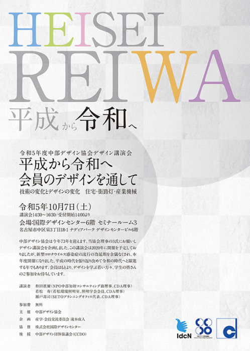 中部デザイン協会(CDA)では、会員、法人会員、サークル会員のみならず、一般の方々に協会の活動意義とその事業を理解してもらう機会として、毎年デザイン講演会を開催しています。今年度は「平成から令和へ 会員のデザインを通して」をテーマに、中部デザイン協会理事の3氏が、長年の知識と経験と実績の貴重な体験を語ります。