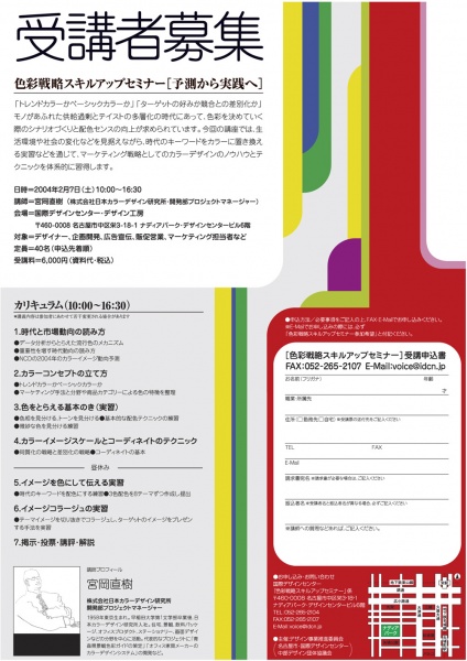 | 問い合わせ先 | 株式会社国際デザインセンター「色彩戦略スキルアップセミナー」係tel052-265-2104 |