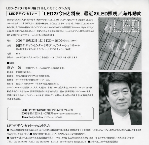 「LED・ケイタイあかり展 21世紀のあかり・プレ万博」の会期初日にセミナーを開催。同展と東京で先に開かれた照明展「Welcome Light 2003」の企画・監修者である落合勉(照明デザイナー/M&Oデザイン研究所所長)が、21世紀の省エネ光源LEDについてのデザイン展望を豊富な経験と情報をもとに語る。