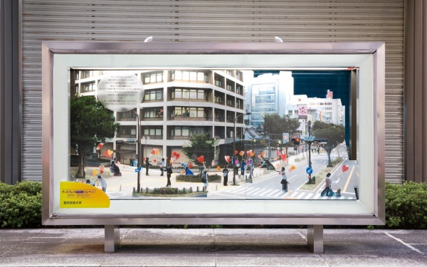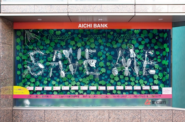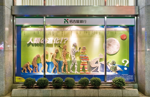 デザインを学ぶ学生たちが名古屋市内中心地の金融機関などのウインドーディスプレイを制作。平成元年の世界デザイン会議の開催を記念して10月に設定された「デザインウィーク」の期間、約1ヶ月の間、街の魅力づくりを図ります。