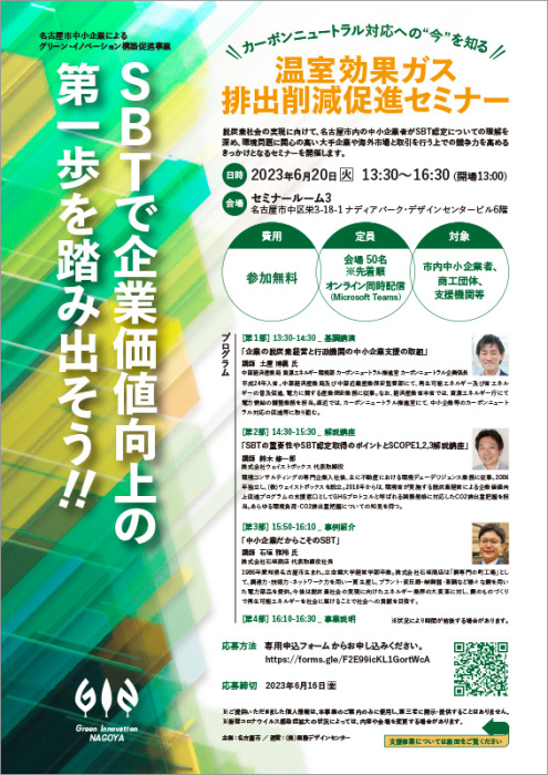 脱炭素社会の実現に向けて、名古屋市内の中小企業者がSBT(Science Based Targets)認定についての理解を深め、今後、環境問題に関心の高い大手企業や海外市場と取引を行う上での競争力を高めるきっかけとなるセミナーを開催。基調講演・解説講座・事例紹介の3本立てで、SBT認定取得のメリットや、カーボンニュートラルをはじめとした環境対応が企業に求められている背景・国際的な動向をわかりやすく解説します。