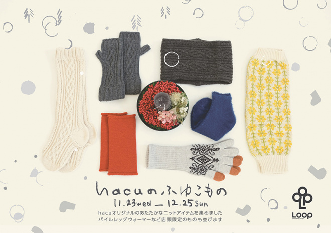 今回は、2022通年出店の「靴下のhacu」が、hacuオリジナルの暖かなニットアイテムを集めたふゆこもののフェアを開催。パイルレッグウォーマーなど店頭限定の商品も並びます。