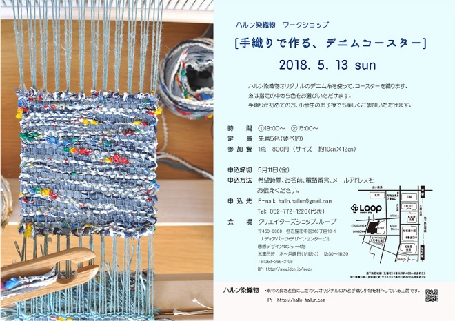 ハルン染織物 ワークショップ「手織りで作る、デニムコースター」(フライヤー・イメージ)