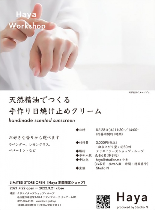 ※新型コロナウイルス拡大防止のため、Haya Workshop「天然精油でつくる手作り日焼け止めクリーム」はやむなく延期することとなりました。延期後の日程は現在調整中です。
