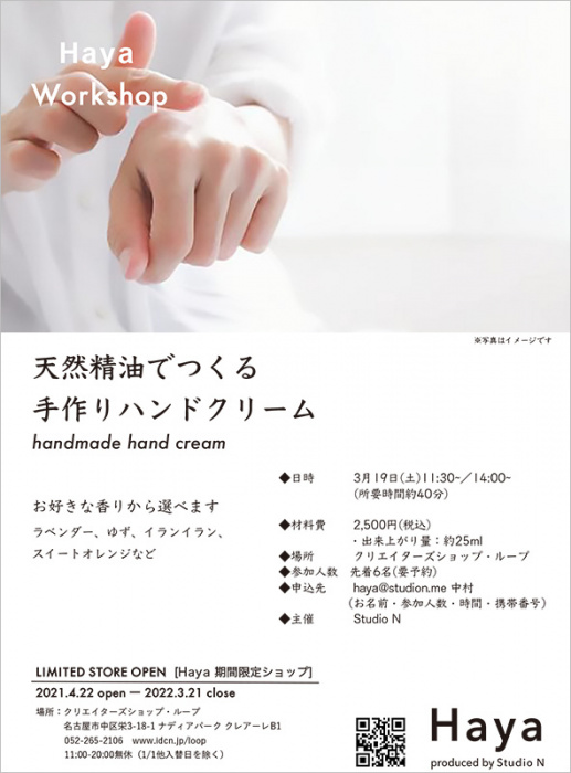 今回は、14期初出店の「Haya」が、ラベンダー、ゆず、イランイラン、スイートオレンジなど、たくさんの精油の中からお好きな香りを選び、ハンドクリームをつくるワークショップを開催します。