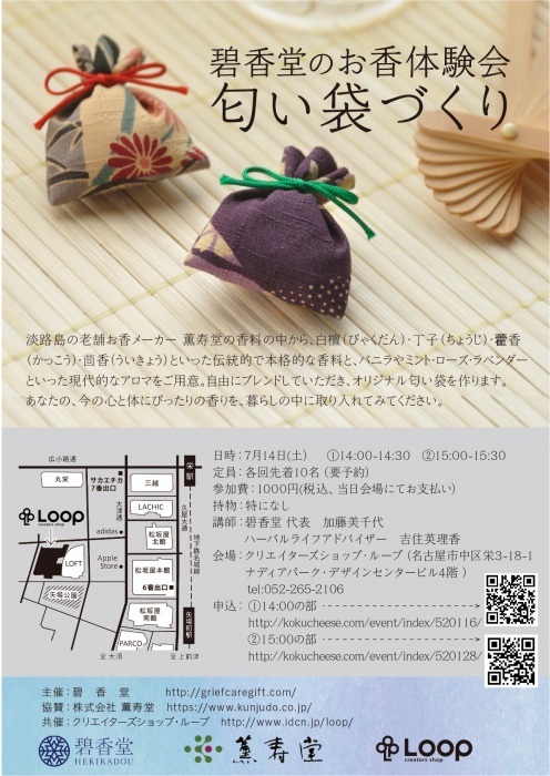 今回は、11期初出店の「碧香堂」が、匂い袋を作る、お香体験会を開催します。淡路島の老舗お香メーカー薫寿堂の香料の中から、白檀(びゃくだん)・丁子(ちょうじ)・藿香(かっこう)・茴香(ういきょう)といった伝統的で本格的な香料と、バニラ・ミント・ローズ・ラベンダーといった現代的なアロマをご用意。自由にブレンドしていただき、オリジナル匂い袋を作ります。