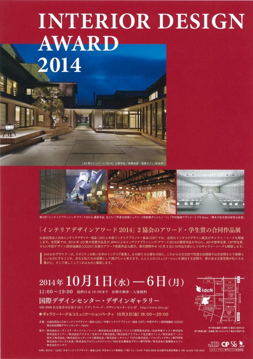 公益社団法人日本インテリアデザイナー協会(JID)と中部インテリアプランナー協会(CIP)によるインテリアデザイン賞展。合同展では、2014年JID賞の受賞作品、JIPAによるインテリアプランニング・アワード2014の優秀作品を中心に、JID中部学生賞、CIP学生賞、中部デザイン団体協議会(CCDO)主催のアワード受賞作品を展示。10月3日には会場でギャラリートークも開催します。