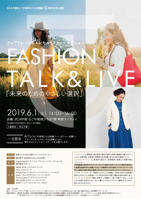 6月1日の一日限定で「なごや地球ひろば体験ゾーン」をショー会場にし、エシカル・コーディネーターの原田さとみ(JICA中部オフィシャルサポーター)による解説と、アコーディオンとギターの生演奏とともに、華やかなファッション・ショーを開催。また、生産地インドと日本を行き来する廣中桃子(合同会社nimai-nitai代表)をゲストに迎えてのトークショーも。申込不要。