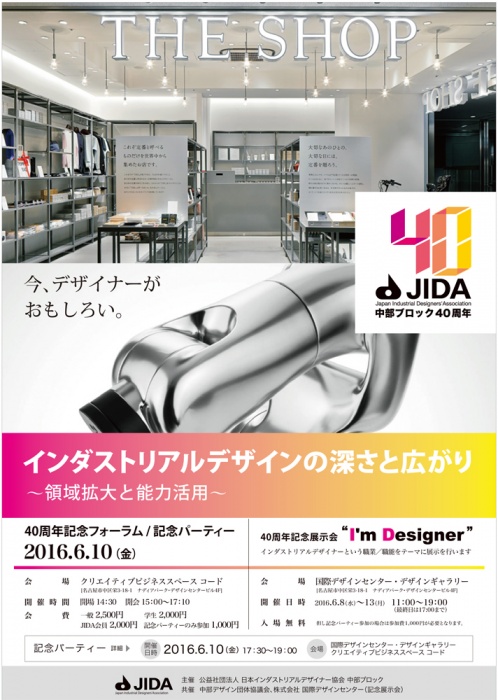JIDA中部ブロック設立40周年記念フォーラム/記念パーティー インダストリアルデザインの深さと広がり〜領域拡大と能力活用〜(イベントスケジュール) 公益社団法人日本インダストリアルデザイナー協会中部ブロック |