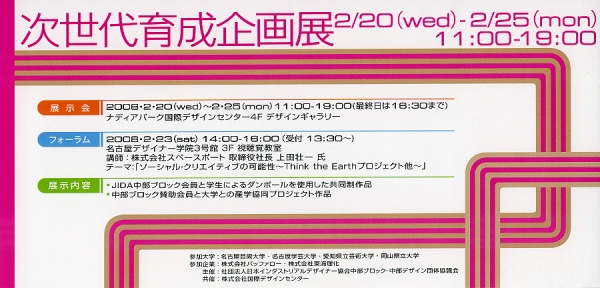 | 問い合わせ先 | 社団法人日本インダストリアルデザイナー協会(JIDA)中部ブロックtel052-722-2207、国際デザインセンター・デザインギャラリーtel052-265-2106(代) |