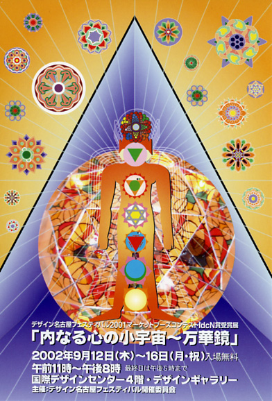 万華鏡そのものに入って映像と音を体感する「体験型立体万華鏡」をはじめとして、人のチャクラと呼ばれる部分と万華鏡を連携させた「チャクラの灯火」。また、壁に作られたたくさんの万華鏡をのぞくといろいろな世界が楽しめる「のぞきの壁」など。心と体を使って楽しんでもらえば、と思います。(デザイン名古屋フェスティバル2001ライブマーケットIdcN賞受賞・水野博之<Mエスパック>)