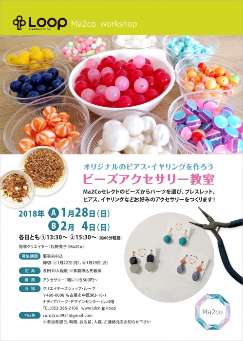 今回は、10期初出店の「Ma2Co」が、ワークショップを開催。Ma2Coセレクトのビーズからパーツを選び、ブレスレット、ピアス、イヤリングなどお好みのアクセサリーをつくります。