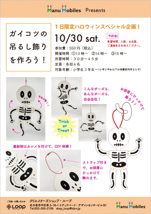 今回は、14期に期間出店する(10月5日〜11月14日)「Manu Mobiles」が、ハロウィンスペシャル企画として、ガイコツの吊るし飾りをつくるワークショップを開催します。