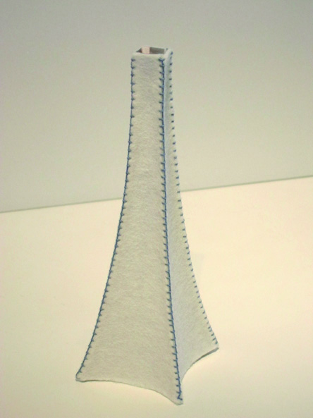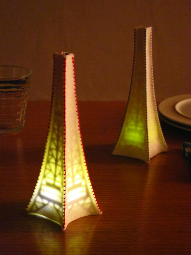 鉄骨の代わりに、柔らかなフェルトを手縫いして、塔(灯)のかたちを作り上げます。灯りをつけると日中は見えないテレビ塔の形が模様として浮き出て、実際のテレビ塔と同じく、昼と夜との雰囲気の違いをお楽しみいただけます。
