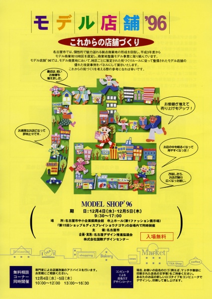 名古屋市では、個性的で魅力溢れる拠点商業地の形成を目指し、平成3年度からモデル商業地10地区を選定し、商業地整備モデル事業に取り組んでいます。モデル店舗’96では、モデル商業地において、地区ごとに策定された街づくりルールに従って整備されたモデル店舗の優れた改装事例をパネルにして展示します。