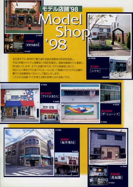 名古屋市では、個性的で魅力溢れる拠点商業地の形成を目指し、平成3年度からモデル商業地10地区を選定し、商業地整備モデル事業に取り組んでいます。モデル店舗’98では、モデル商業地において、地区ごとに策定された街づくりルールに従って整備されたモデル店舗の優れた改装事例をパネルにして展示します。