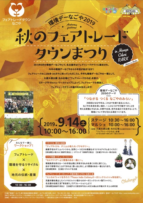 | 共催・後援など | 協力= NPO法人フェアトレード名古屋ネットワーク(FTNN)、世界フェアトレードデーなごや実行委員、株式会社国際デザインセンター、後援=一般社団法人日本フェアトレード・フォーラム(FTFJ)、一般社団法人日本エシカル推進協議会、JICA中部 |