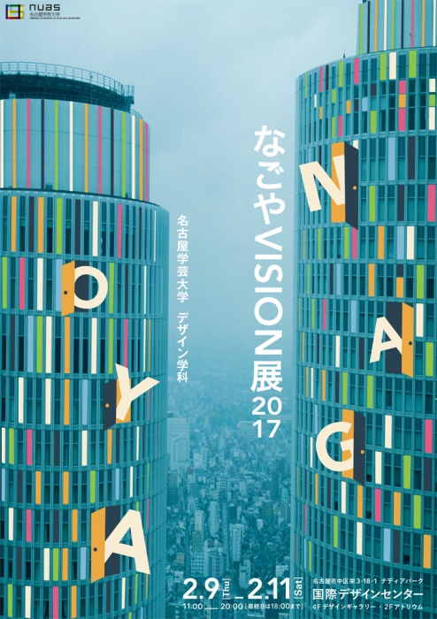 名古屋学芸大学メディア造形学部デザイン学科3年次学生による「これからの名古屋」を提案するデザイン展。ビジュアルコミュニケーション、スペースデザイン、プロダクトデザイン、学究デザインビジネスの4領域のいずれかに属する学生の作品を展示。