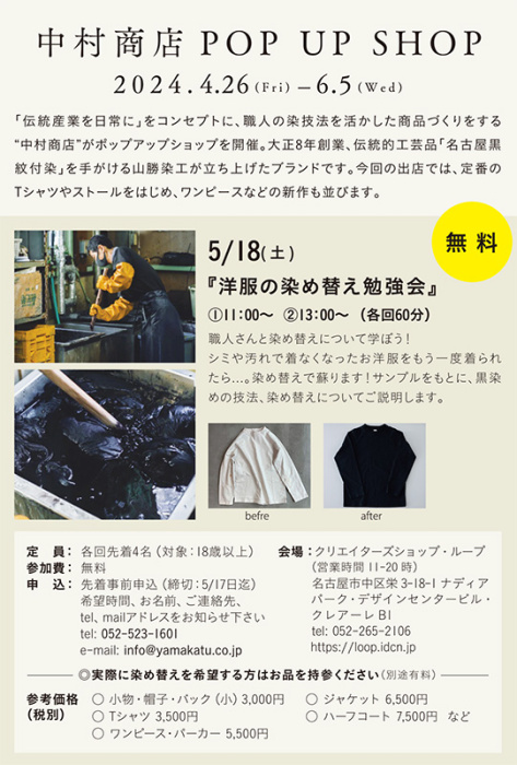 今回は、Loop2024に期間出店する(4月26日〜6月5日)「中村商店」が、サンプルをもとに黒染めの技法や染め替えについて説明し、洋服を染め替えて魅力的なアップサイクルをつくる機会を提供。デニムやシャツなど、シミや汚れなどで着なくなった綿や絹、ウールなどの天然素材のアイテムを、職人の手でお好みの色に染め替えてみませんか。