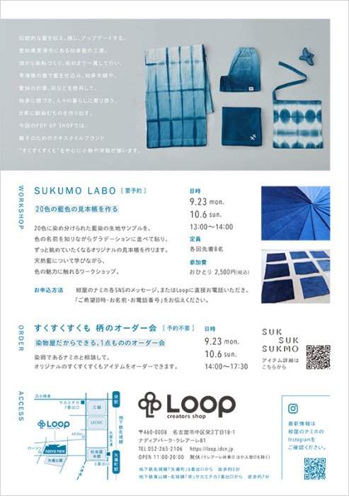 紺屋のナミホWORKSHOP「SUKUMO LABO 20色の藍色の見本帳を作る。」(フライヤー・イメージ)