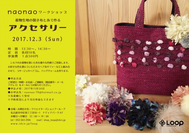 着物生地の裂き布(さきぬの)と糸で作るアクセサリー(フライヤー・イメージ)