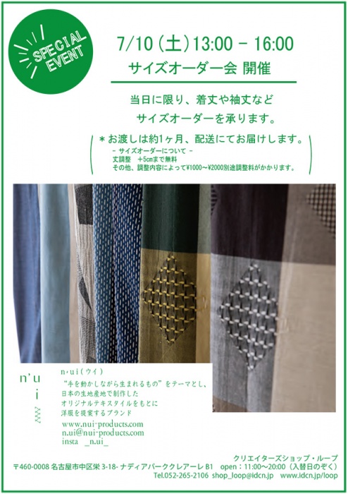 今回は、14期期間出店(6月1日〜7月11日)の「n’ui」が、店頭商品を基本に、着丈や袖丈など、気になるサイズ感をお客様のお好みでオーダー可能な、サイズオーダー会を開催。デザインとのサイズバランスについて、クリエイターがその場で相談に乗ります(完成品は後日配送/納期約1ヶ月程度)。