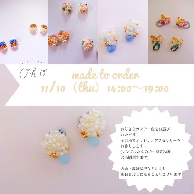 9期初出店の、金属作家と布物作家によるオリジナルアクセサリーユニット「OHO(オーホー)」が、merrygoroundのtsubuシリーズをメインとしたイヤリングやピアスをお客様のお好みのお色味でその場でオーダーメイドできる、オーダー会を実施します。