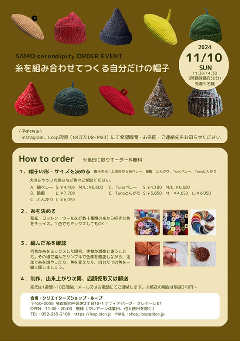 今回は、Loop2024に期間出店する(10月12日〜11月21日)「SAMO serendipity」が、色とりどりの糸を組み合わせて自分だけの帽子を作る、オーダー会を開催します。帽子の形(鍋ベレー、鍋帽、とんがり、Tunoベレー、Tunoとんがり)、サイズ(S、M、L)、糸(和紙、ウール、コットンなど/2〜3本組み合わせも可)を選んで、オリジナルの帽子をデザインします(完成品は後日店頭で引き渡し、または郵送(別途370円要)/製作約1週間〜10日)。