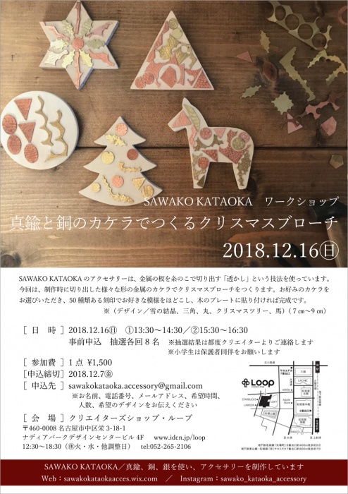 | 問い合わせ先 | クリエイターズショップ・ループtel052-265-2106、SAWAKO KATAOKA sawakokataoka.accessory@gmail.com |
