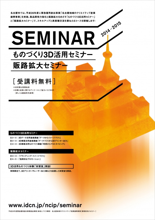 名古屋市では、平成26年度に緊急雇用創出事業「名古屋地域のクリエイティブ産業振興事業」を実施。製品開発力強化と販路拡大をめざす「ものづくり3D活用セミナー」と「販路拡大セミナー」で、スキルアップと異業種交流を兼ねた5コースを開催します!