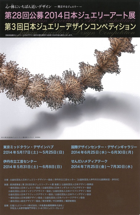 | 主催 | 公益社団法人日本ジュエリーデザイナー協会、伊丹市立工芸センター(公益財団法人伊丹市文化振興財団・伊丹市)、株式会社国際デザインセンター、中部デザイン団体協議会 |
