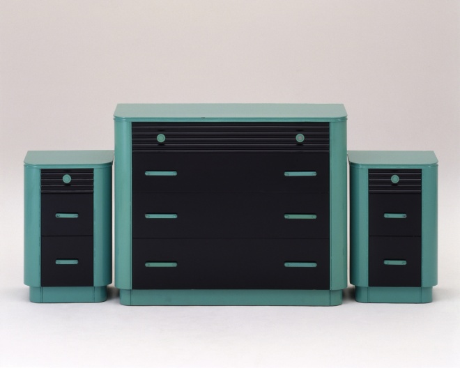 国際デザインセンターは、20世紀のデザイン史において日本の産業デザインにも大きな影響を与えた、1930年代アール・デコ期のアメリカのデザイン製品を所蔵しています。コレクションは、家具から電化製品、食器、雑誌、ポスターまで、当時のライフスタイル全般にわたる多様なもので構成され、作品数は約2,000点にもなります。大量生産時代をむかえたアメリカで流行したこのデザイン様式は、20世紀の社会や産業構造の大転機を示す貴重な資料であり、その遊び心あふれるデザインは今日でも新鮮な魅力を放っています。毎回、テーマに沿って作品をご紹介するコレクション展。今回は当時の生活用品に登場した個性的な“色”の数々を、それらの表現の源となった1930年代の技術革新・新素材とともにご紹介します。
