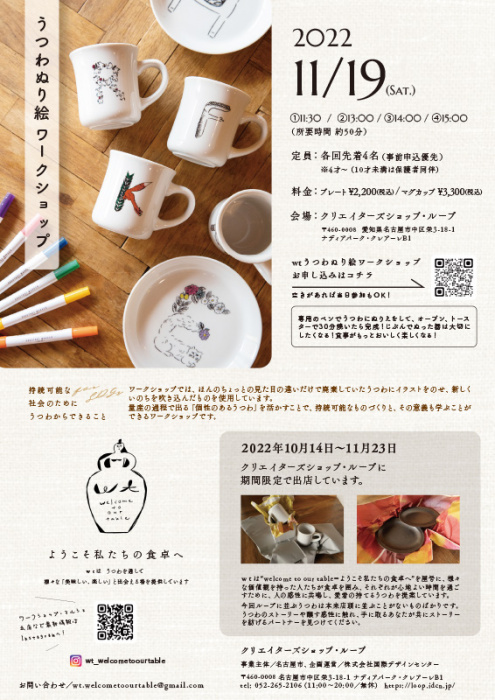 今回は、Loop2022に期間出店する(10月14日~11月23日)「wt」がワークショップを開催。イラストを選び、陶磁器専用の水性ペンで、ぬりえ感覚でオリジナルのマグカップ、プレートが作れます。ご自宅のオーブンやトースターで焼き上げるため、焼成後すぐにお使いいただけます。